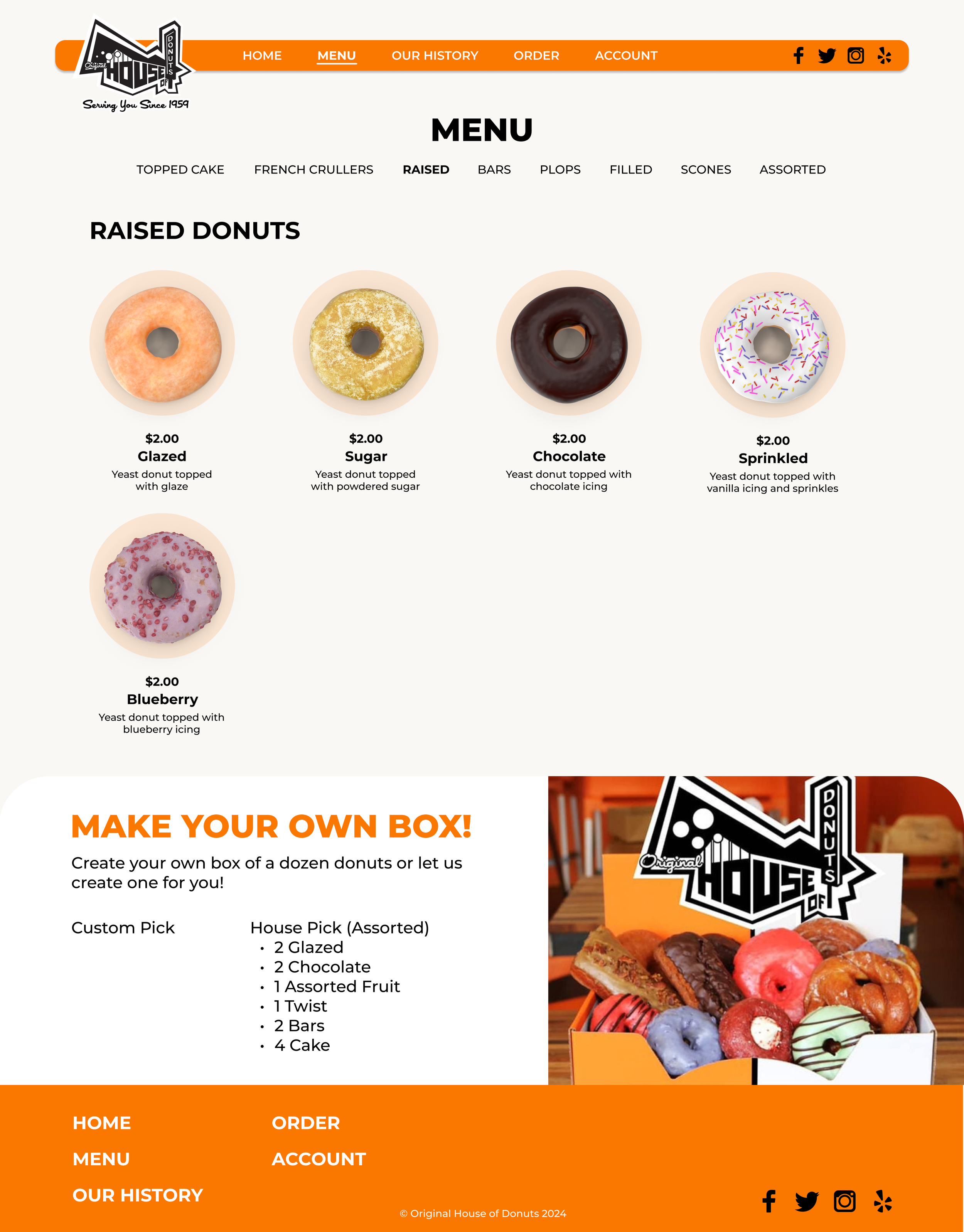 Their current menu is a bit overwhelming to look at with all the text and the black text on a bright orange background doesn’t allow for much contrast. I made the background a solid color and used a menu tab bar to easily break down the different categories and allow for easier navigation. I included images of donuts so the customer gets a better idea of what they’re ordering as that is an important factor.